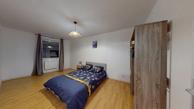 La chambre est entièrement meublée et dispose d’un lit double, d’un placard de rangement ainsi que d’une table de chevet.