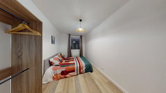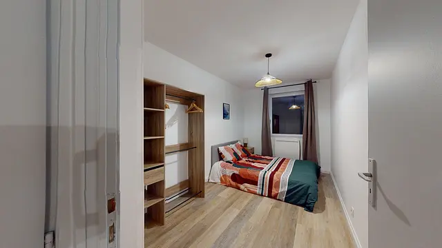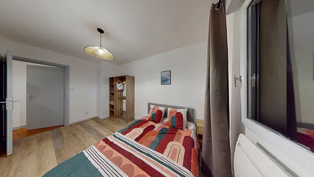 La chambre est entièrement meublée et dispose d’un lit double, d’un placard de rangement ainsi que d’une table de chevet.