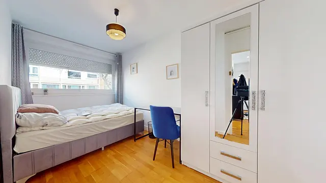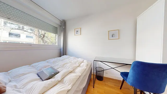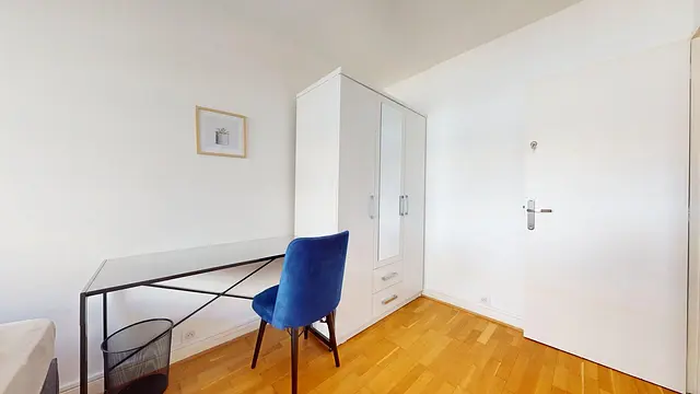 La chambre est équipée d'un lit double, d'un bureau et d'une chaise ainsi que d'une armoire.
