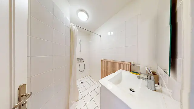 Juste à côté de la chambre, vous bénéficierez également d'une salle d'eau privative avec une douche et un meuble vasque avec miroir.