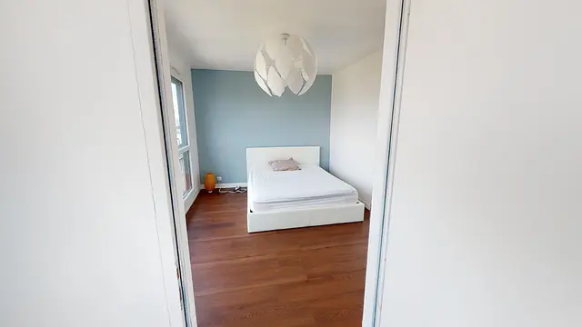La chambre 3 accessible depuis le salon est entièrement équipée avec un lit double, un bureau, une chaise et des rangements.
