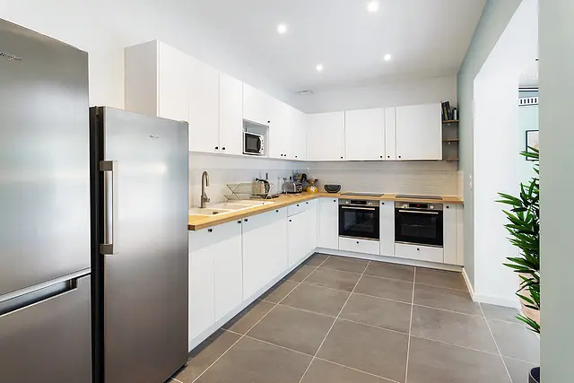 - Une cuisine entièrement équipée et fonctionnelle: frigos, plaques de cuisson, hotte, rangement, fours, micro-ondes, etc.