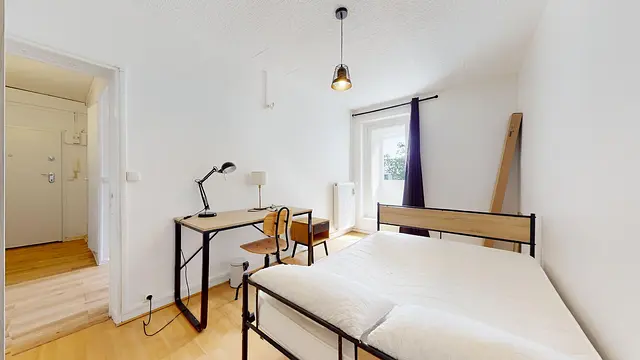 La chambre 2 se compose d'un lit double, d'une armoire de rangement, d'un bureau accompagné d'une chaise et d'une lampe, ainsi que d'une table de chevet avec sa lampe.