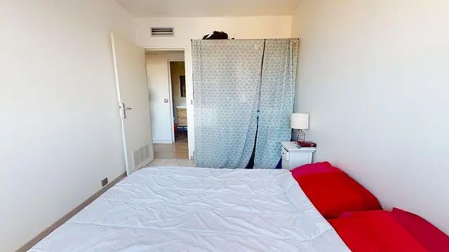 Cette chambre dispose d'un lit double, deux tables de chevet avec une lampe, une grande lampe ainsi qu'un placard dressing.