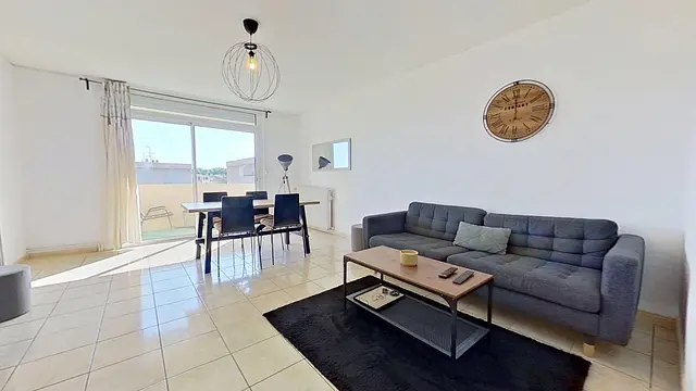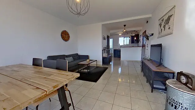 La pièce de vie est meublée avec un canapé, une table basse, un meuble TV avec TV, une table pouvant accueillir 4 personnes. On y trouve un grand balcon traversant deux des chambres, il est meublé d'une table, de deux chaises et donne sur une vue dégagée.