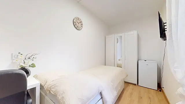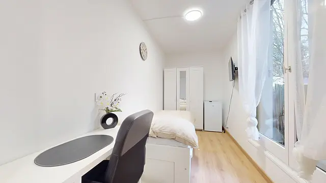 La chambre est équipée d'un lit, d'un bureau avec une chaise, d'une télévision, d'un petit réfrigérateur et d'une armoire.