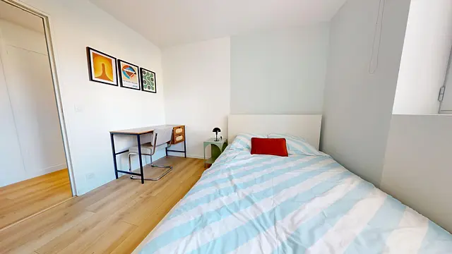 Elle est équipée d'un lit (double), bureau, placard de rangement et commode de chevet.u
