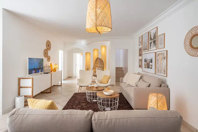 - Pièce de vie : Grand salon aménagé avec soin (2 tables basses, 2 canapés, fauteuils dont un suspendu, TV écran plat).