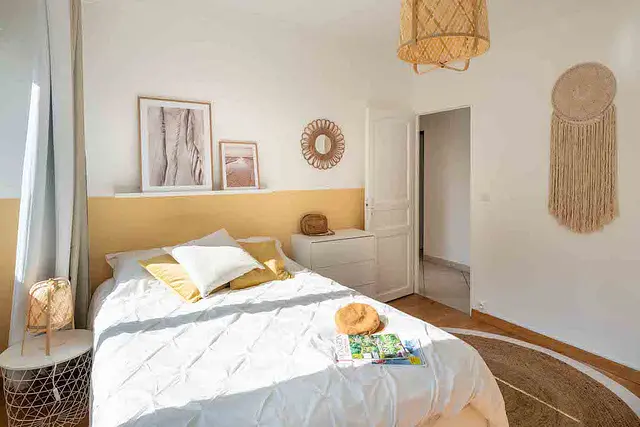 La chambre 3 est au milieu du couloir sur la gauche, elle est entièrement meublée avec un lit double, une commode, un bureau, un grand placard. La chambre a été redécorée avec goût et modernité et est très lumineuse