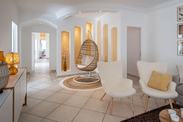 - Pièce de vie : Grand salon aménagé avec soin (2 tables basses, 2 canapés, fauteuils dont un suspendu, TV écran plat).