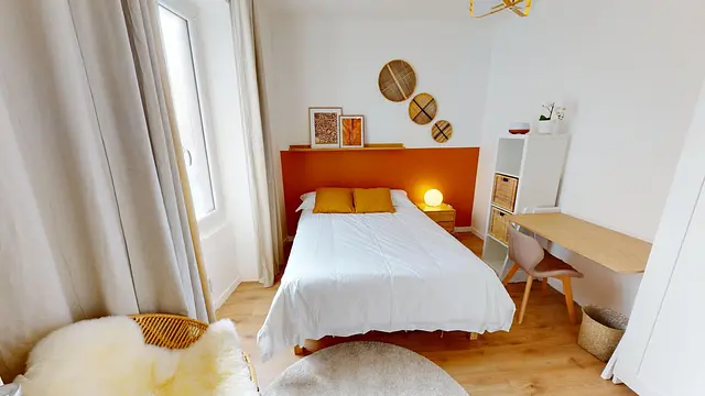 La chambre 3, accessible depuis le salon, est la plus grande de la coloc avec ses 14 m2. C'est la raison pour laquelle elle contient un équipement complet : lit double, bureau, meuble case, commode et un super fauteuil!