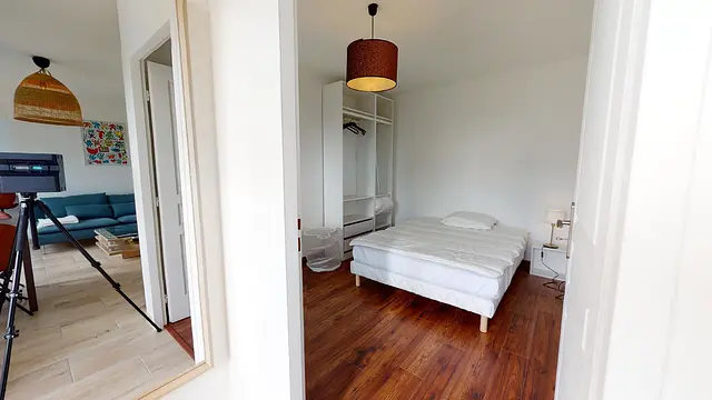La chambre 4, la plus grande, a une belle disposition, donne directement sur le balcon, en restant très lumineuse avec une grande penderie. Le lit double, la chaise et le bureau sont de rigueur, et font de cette chambre un petit cocon, et donc un joli coup de coeur !