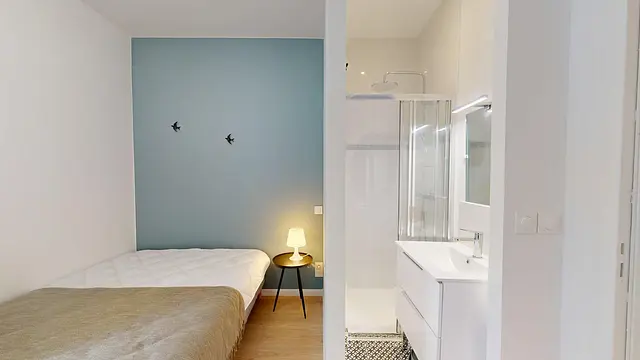 Elle dispose une salle d'eau privative avec douche et meuble vasque.