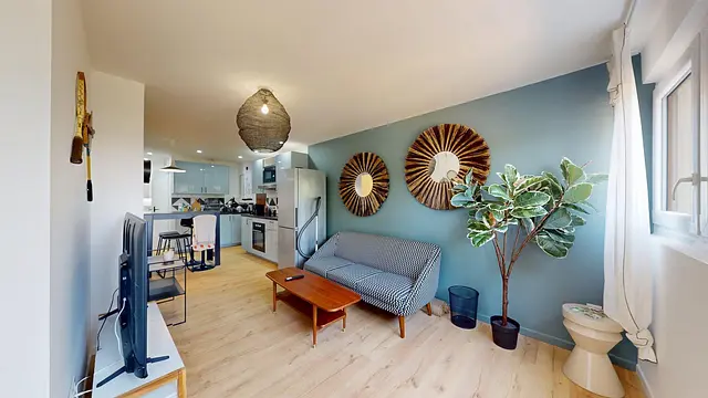 Cette colocation de quatre chambres s'ouvre sur une pièce de vie spacieuse et lumineuse. La cuisine ouvert est équipée d'un réfrigérateur congélateur, d'un four, de plaques de cuisson avec une hotte, d'un grille-pain, d'une machine à café, d'un micro-ondes, d'un évier avec égouttoir, de nombreux rangements ainsi que d'un mange-debout avec quatre chaises, idéal pour partager des repas entre colocataires.
