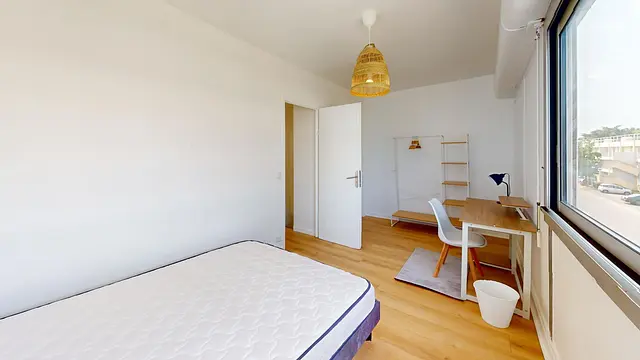 La chambre est louée avec un bureau, un lit double, une penderie et un placard.