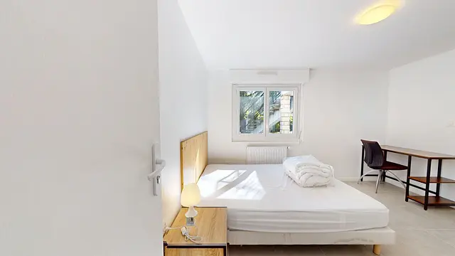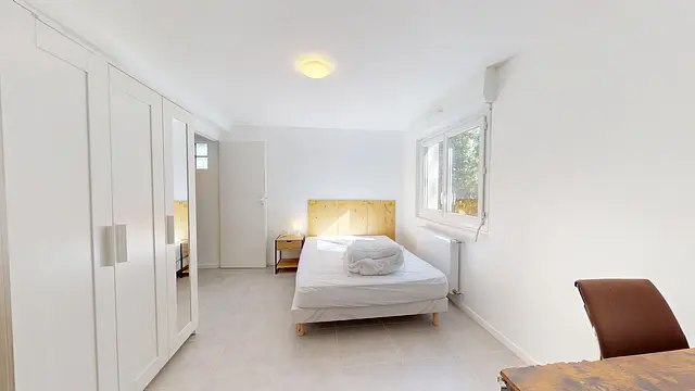 La chambre est équipée d'un lit double, d'un bureau avec une chaise, d'une commode, d'une table de chevet et d'une penderie.