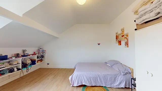 Cette chambre spacieuse est louée avec un bureau, une chaise, un lit double, un placard et des rangements. Une fenêtre vient donner de la luminosité à cette pièce.