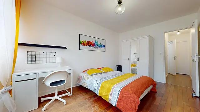 La chambre mesure 13 m² et est louée avec un lit double, un bureau, d'une armoire et d'une panière à linge.