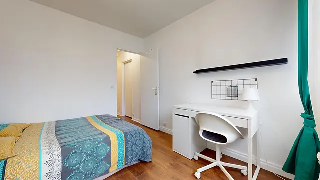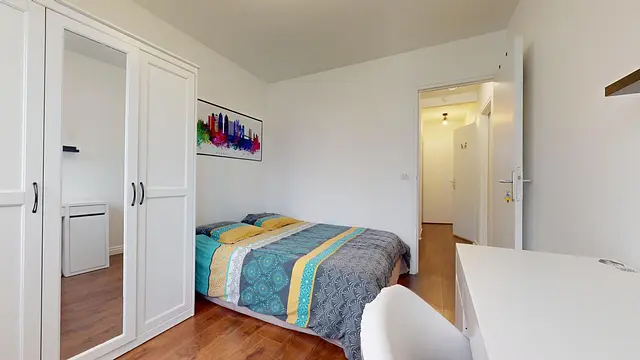 La chambre (mesurant 9 m²) est louée avec un lit double, un bureau, d'une armoire et d'une panière à linge.