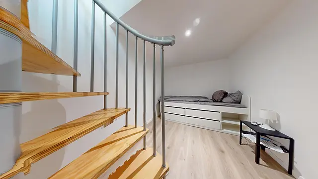 La chambre est sur deux niveaux : une pièce avec bureau et en descendant un lit avec rangements.