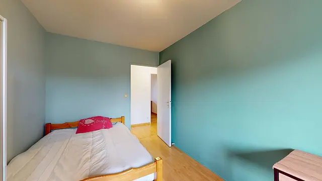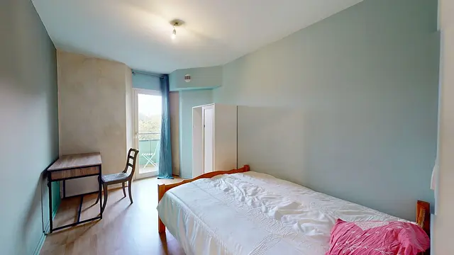 La chambre est équipée d'un lit double, d'un bureau et d'un placard de rangement. Le plus: elle donne accès au balcon (partagé avec la chambre 1 et le séjour).
