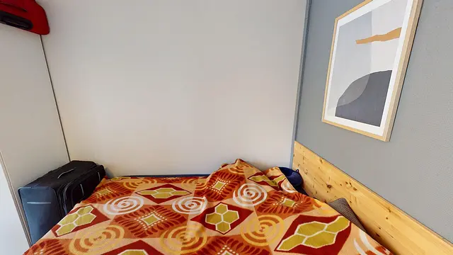 Cette chambre dispose d'un lit double, d'un meuble de rangements, une armoire, une télévision ainsi que d'un bureau avec une lampe et une chaise. Cette chambre a un accès direct sur le balcon du logement, aussi accessible depuis la pièce de vie et la CH3.