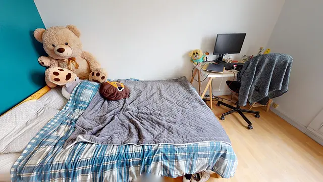 L’aménagement des 10m2 de la chambre 3 offre tout le confort grâce à son lit double, son bureau, sa chaise et son placard de rangement intégré.