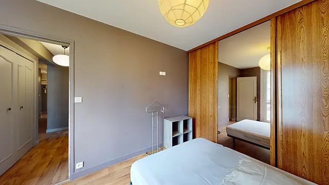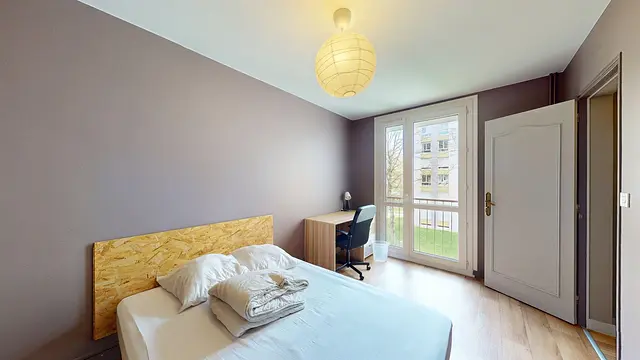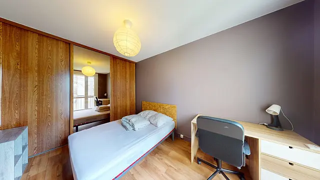 La chambre est équipée d'un lit double, d'un bureau avec une chaise ainsi que d'une grande penderie.