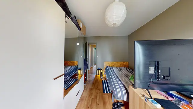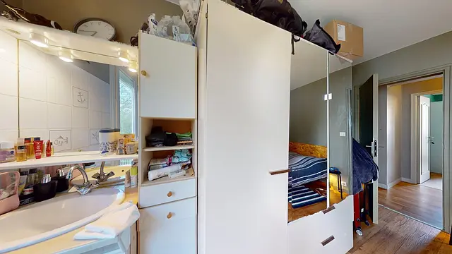 Le plus de cette chambre est le coin privatif meuble-vasque avec miroir qui vous permet une intimité en plus au sein de la colocation.