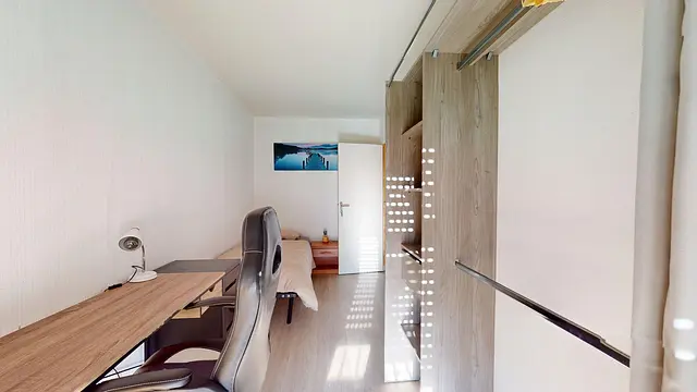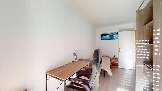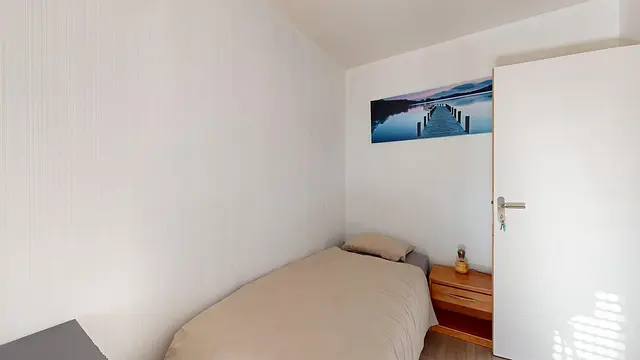 La chambre est équipée d'un lit simple, d'un bureau et d'une chaise, d'un placard type penderie et d'une table de nuit.