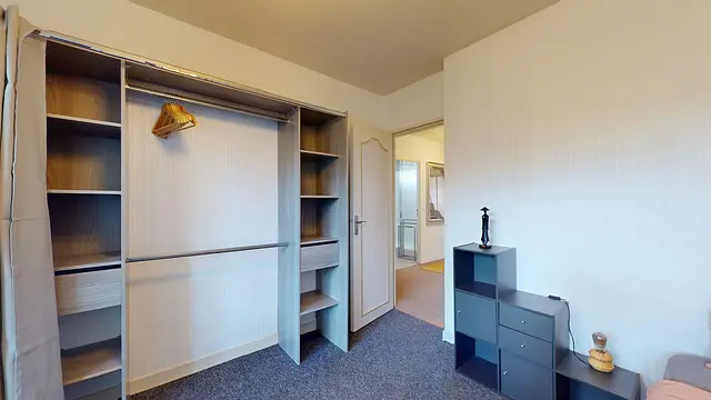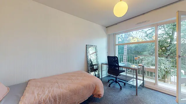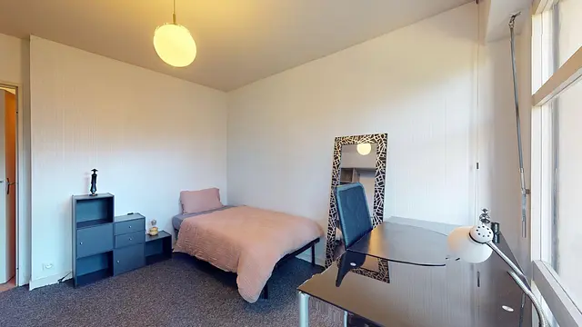 La chambre est équipée d'un lit simple, d'un bureau et d'une chaise, d'un placard type penderie, d'un miroir et d'un meuble à rangement.