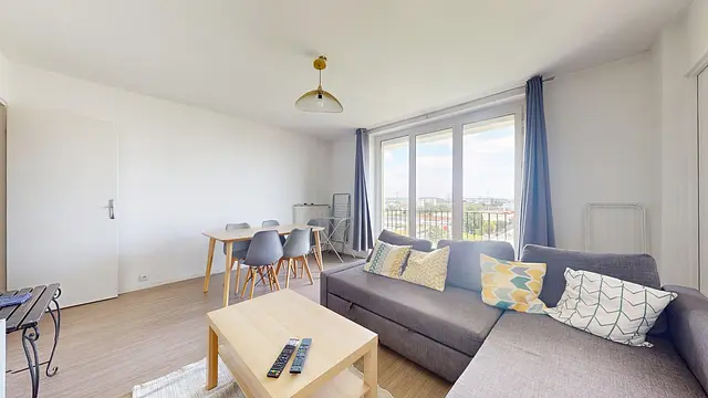 Le séjour, spacieux et lumineux, est aménagé d'un canapé d'angle, d'une table basse, d'un meuble TV avec une télévision, ainsi que d'une table avec cinq chaises, idéal pour partager des repas entre colocataires.