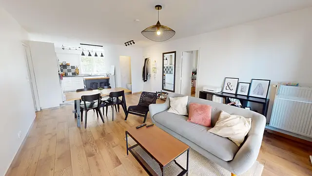 Cette colocation de 5 chambres s'ouvre sur une grande pièce de vie avec un coin séjour et un coin cuisine.