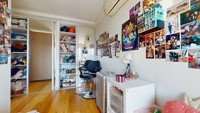 Cette chambre dispose d'un lit double, d'une table de chevet, d'un bureau avec une chaise, d'une bibliothèque ainsi que d'un placard mural.