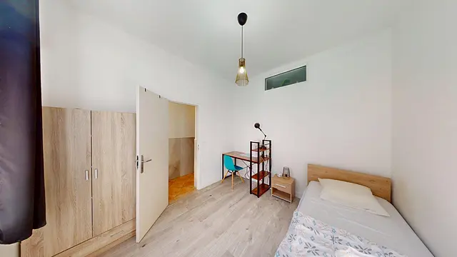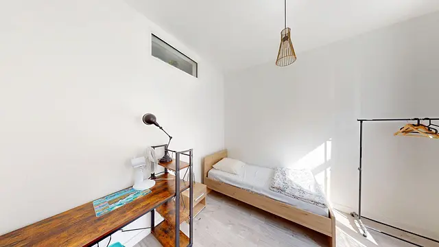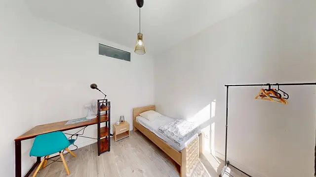 La chambre est équipée d'un lit simple, d'une table de nuit, d'une armoire, d'un bureau ainsi que d'une chaise.