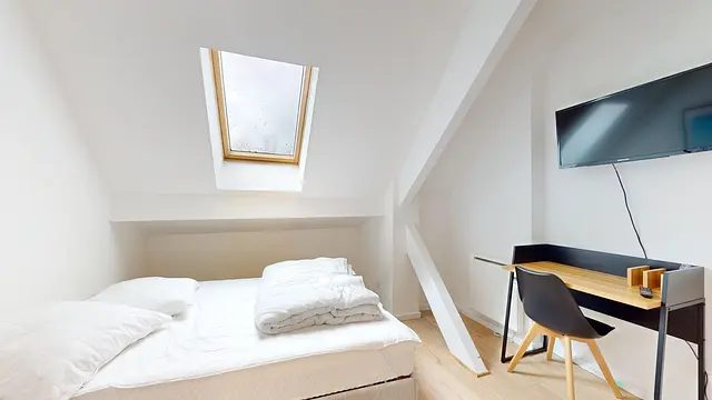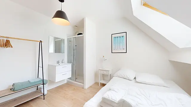 La chambre est équipée d'un lit double, d'un bureau, d'un télévision, d'une penderie et d'une douche privative, meuble vasque et miroir.