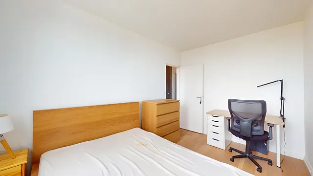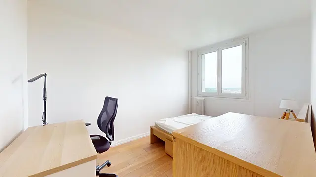 Cette chambre lumineuse est louée avec un lit double et un bureau. Une fenêtre vient donner de la clarté à cet espace.