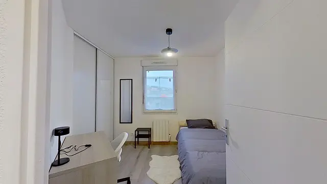La chambre est équipée d'un lit simple, d'une table de nuit, d'un bureau et une penderie.