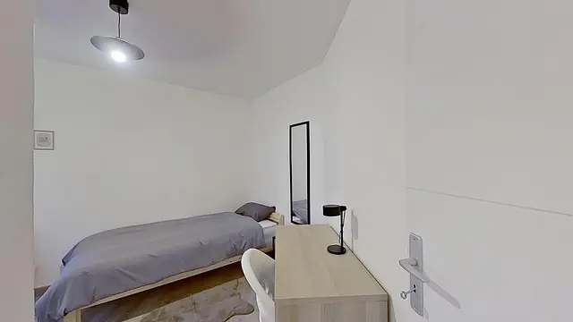 La chambre est équipée d'un lit simple, d'une table de nuit, d'un bureau et un placard.