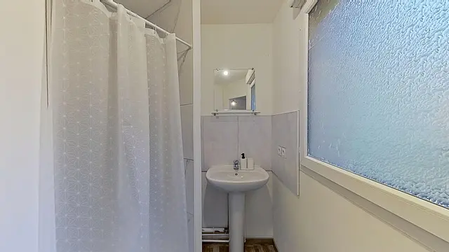 La troisième salle d'eau, non privative, possède une douche, un meuble vasque avec miroir et un sèche-serviette. Il y a également une machine à laver.