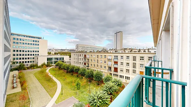 Le séjour s’ouvre sur un balcon filant, parfait pour profiter des beaux jours et d’une vue dégagée sur les arbres du cours Clémenceau.
