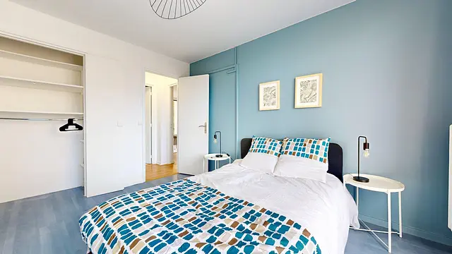 🛏️ Chambre 1 : Spacieuse et lumineuse, elle est équipée d’un lit double, d’un grand dressing intégré, d’un bureau avec étagère et d’un accès direct au balcon. Sa décoration aux tons bleus apporte une touche apaisante et moderne.