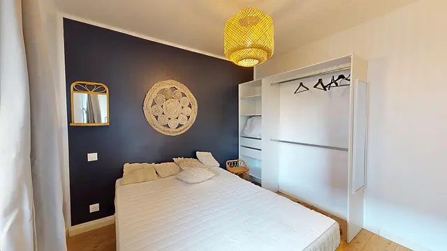 Elle est équipée d'un lit double, d'un bureau, d'un placard de rangement. Le plus: elle possède une salle de bain privative.