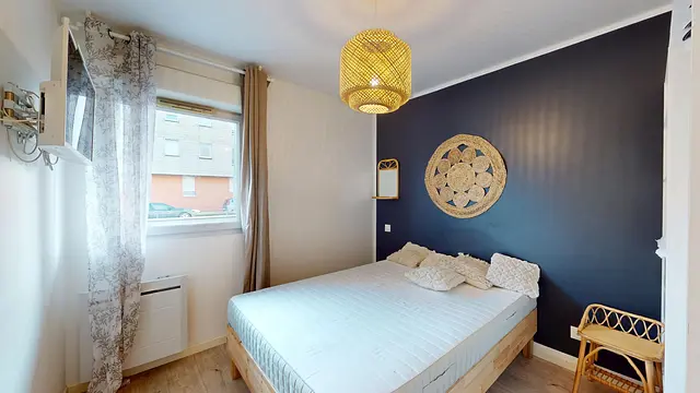 Une salle d'eau complète le logement, elle est équipée d’une douche et d’un meuble vasque avec miroir, tandis que les WC séparés garantissent un confort optimal.