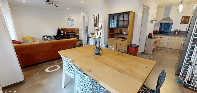 La pièce de vie spacieuse comporte un coin salon : fauteuil, table basse, cheminée ancienne, ainsi que canapé en cuir. L'espace salle à manger est agréablement meublé avec une table à manger, un grand buffet de cuisine, ainsi qu'une télévision écran plat et un meuble télé.