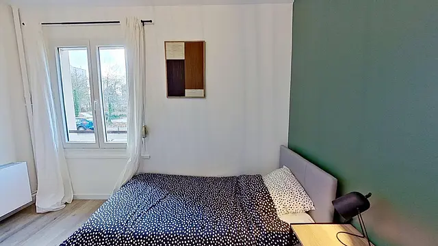 La colocation s’ouvre sur un séjour lumineux et spacieux de 12 m². Vous y trouverez un canapé, une table basse, un meuble TV et une télévision. Une table à manger ronde avec chaises est idéale pour partager des moments conviviaux.