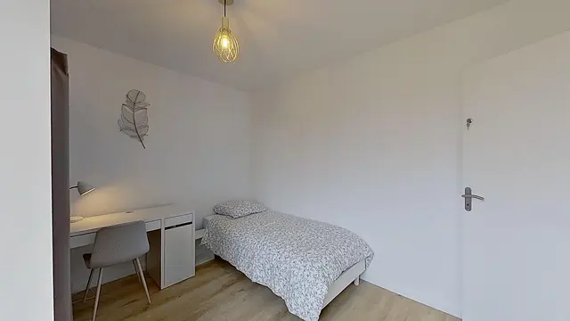 Elle est équipée d'un lit simple, bureau, et placard de rangement.