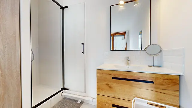 La salle d'eau, moderne, possède une douche, meuble vasque avec rangements, sèche-serviette. Deux toilettes séparées complètent l'appartement.