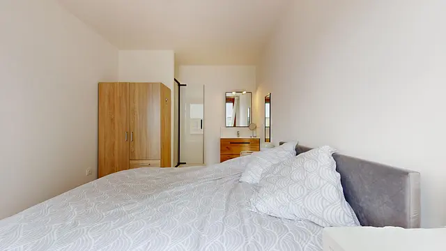 Cette chambre est meublée avec lit double, bureau, et placard de rangement. Le plus : un espace salle d'eau privatif avec meuble vasque, miroir, ainsi qu'une douche.