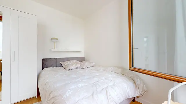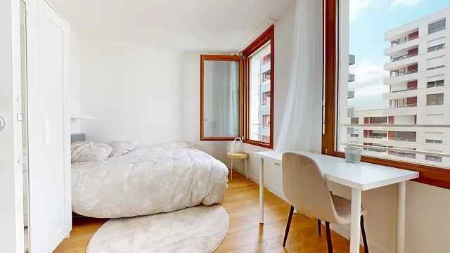Cette chambre est meublée avec lit double, bureau, et placard de rangement.